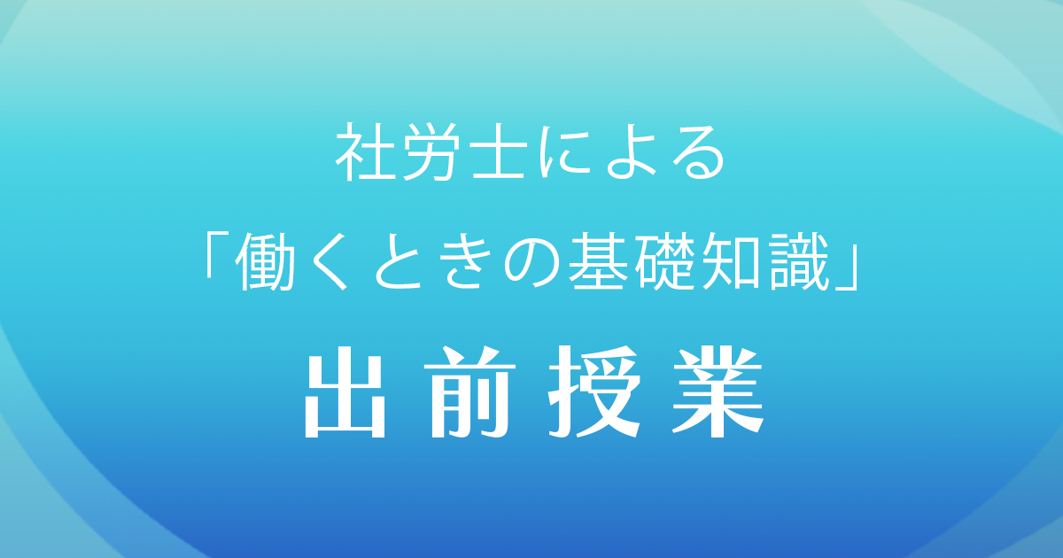 この出前授業では、「知っておきたい働くときの基礎知識〜社会に出る君たちへ」のテーマで、これから初めて社会に出て働くにあたって事前に知っておきたい基礎知識を、各学校を担当する社労士が解説していくものです。